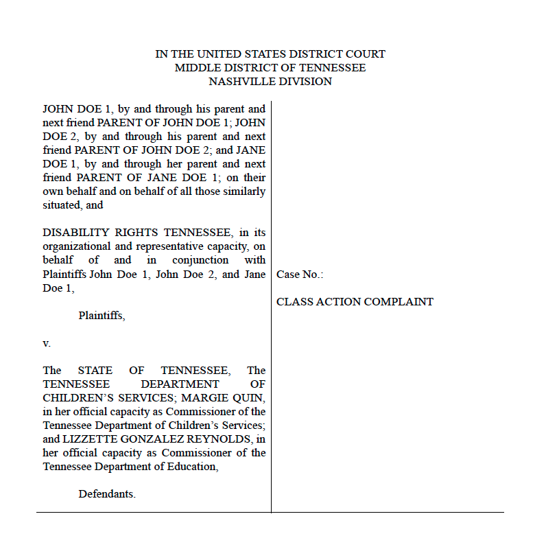 Disability Rights Tennessee serves in the case both as counsel and as an organizational plaintiff. The organization is joined by individual plaintiffs John Doe 1, John Doe 2, and Jane Doe 1, all of whom are youth currently or formerly in DCS custody. Together, they filed the case in the U.S. District Court for the Middle District of Tennessee against the State of Tennessee, the Tennessee Department of Children’s Services (“DCS”), DCS Commissioner Margie Quin, the Tennessee Department of Education (“TDOE”), TDOE Commissioner Lizette Gonzalez Reynolds, and Doe Defendants.
